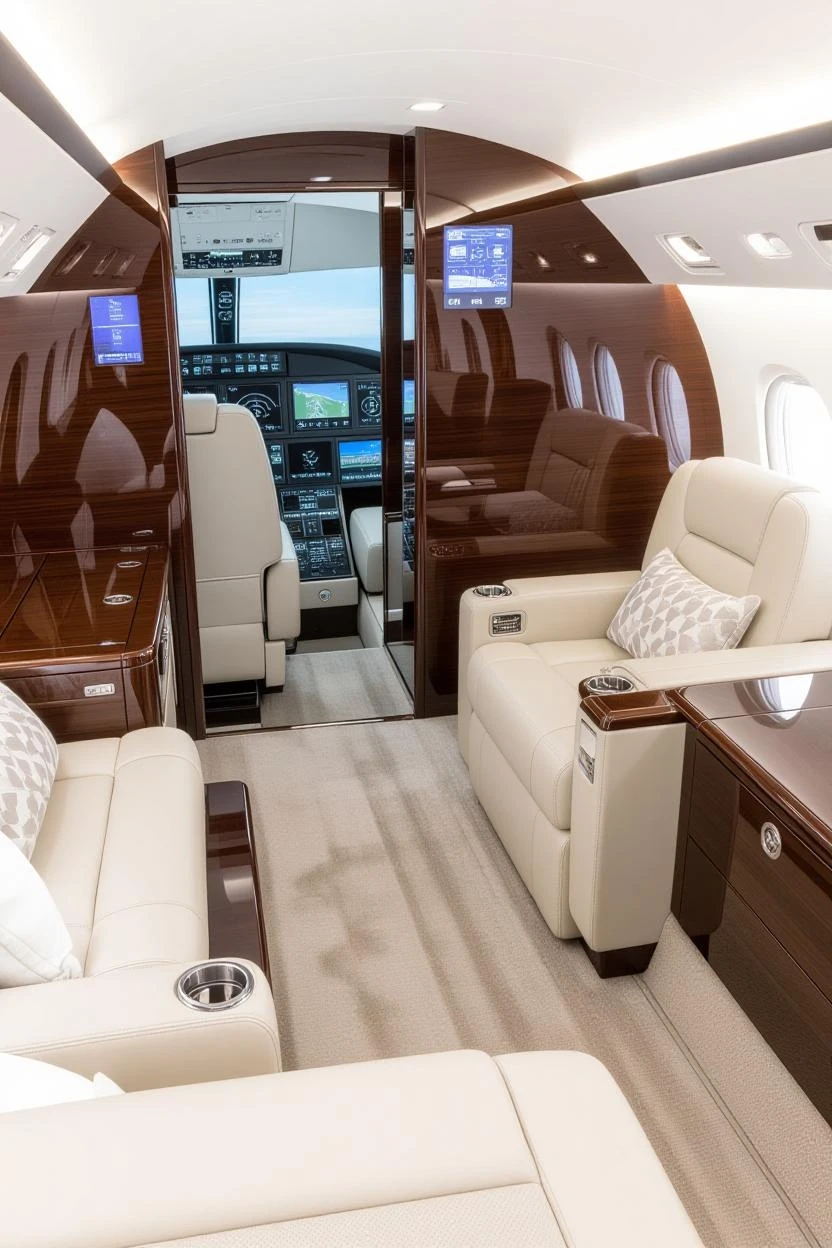 Since passengers spend more time on these long range jets, they are equipped with the most comfortable interiors and the most advanced, up-to-date on-board technologies. Multi-media and business facilities are standard, as well as space for custom seating configurations, with bedrooms for overnight flights, and/or conference table & seats for business flights.